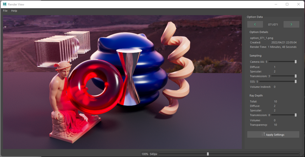 Once you are happy with the quality of the displayed image, and with the recorded render time for that frame displayed above the settings, you can then click "Apply Settings" at the bottom of the window to have these render settings applied to your scene.