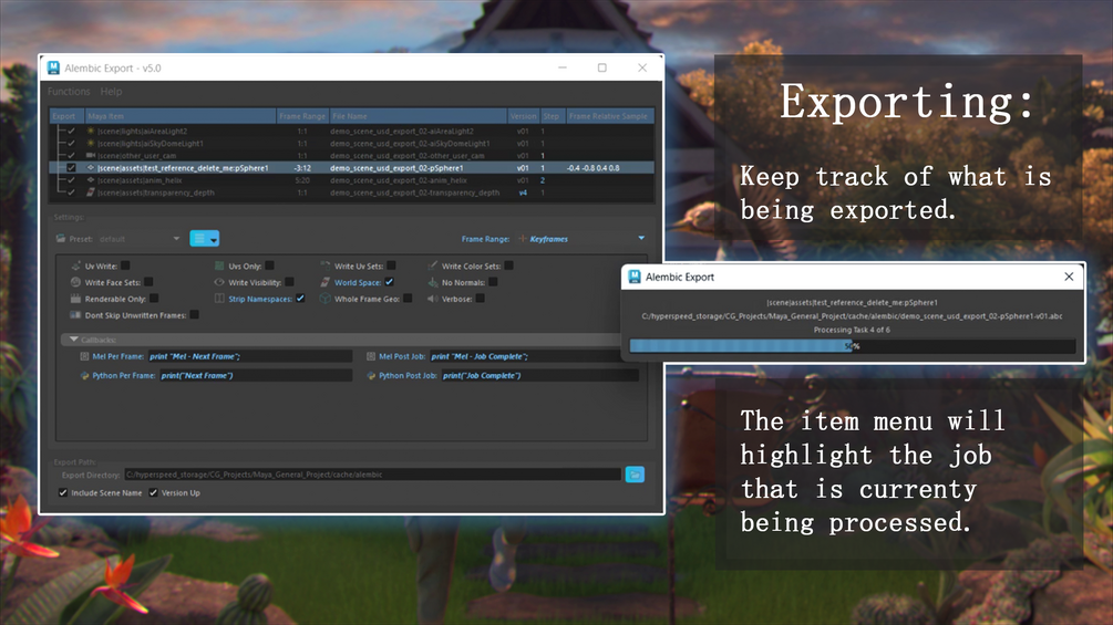 The interface allows you to select any number of objects within Maya and populate them into an interactive panel for batch alembic export.