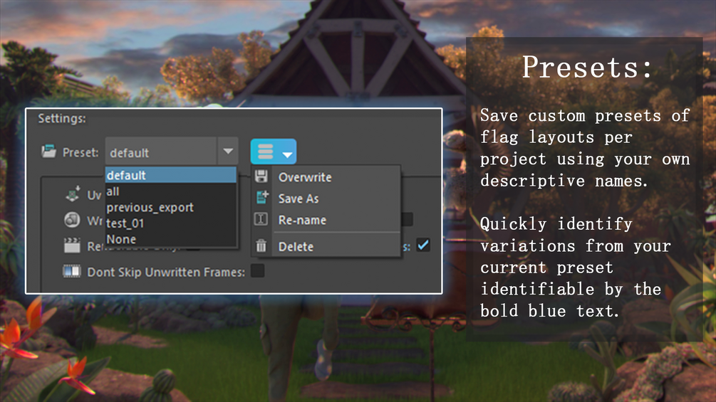 - Choose from a number of available flags. Some of which have been set by default to give good results in a single click.